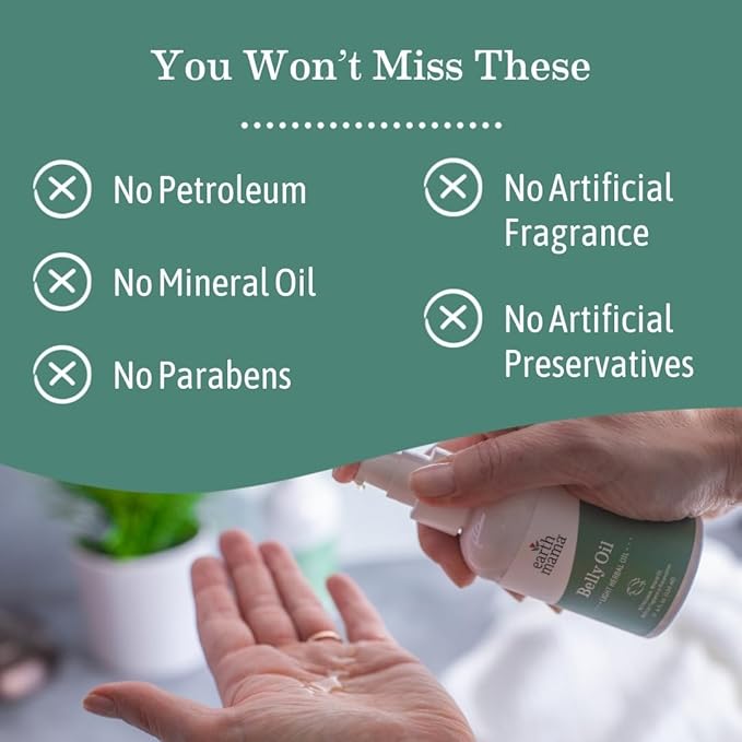 - SAFE FOR PREGNANCY & BEYOND – You’ll never find petroleum, synthetic preservatives, or artificial fragrances so you can slather this organic belly oil with abandon on your belly, breasts, hips… everywhere.