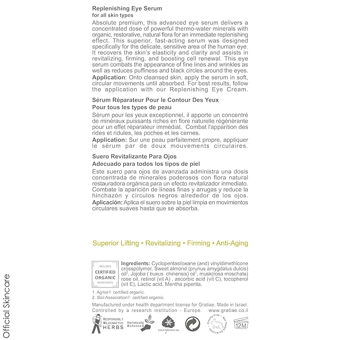 - 🌱 MONEY BACK GUARANTEE: We know you will be impressed with our replenishing eye serum and high-quality customer service so we offer a 30-day refund policy from date of purchase; please contact us if you have any concerns so we can rectify the situation quickly; BUY WITH CONFIDENCE GRATIAE ORGANIC REPLENISHING EYE SERUM, with retinol & vitamin E.
