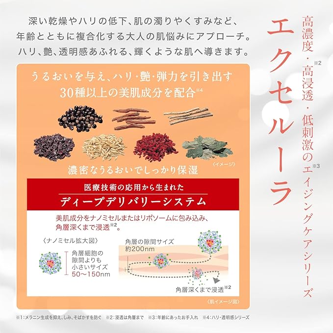 - Though highly concentrated, penetrates into the skin like soaking into, and offers elastic skin like being pushed back from the inside.