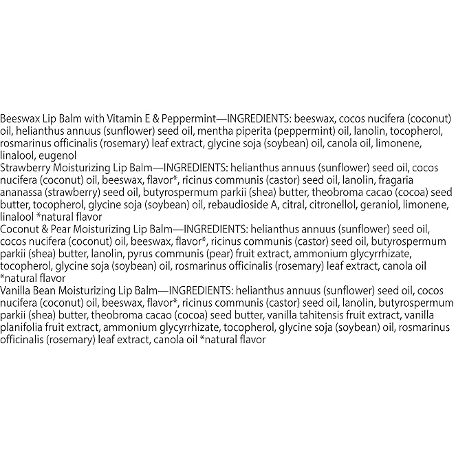 - FOUR REFRESHING FLAVORS: Delight the senses with Beeswax, Strawberry, Coconut and Pear, and Vanilla Bean flavors that will encourage you to apply flavored lip balm over and over again