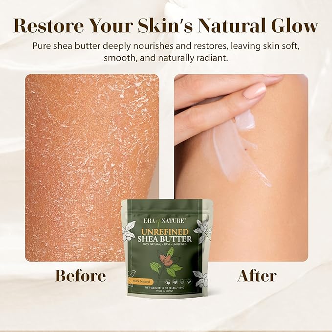 - TRADITIONAL BEAUTY SECRET: For centuries, organic african shea butter has been treasured for natural skin therapy. Our unrefined shea butter delivers deep moisture and healing for radiant, healthy skinβmaking it a trusted addition to your body butter base or lotion bar blends.