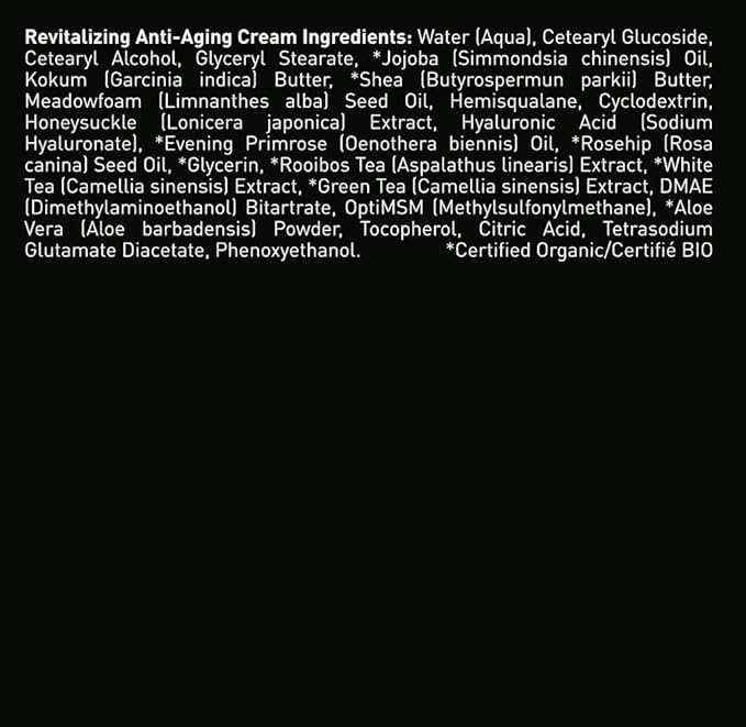 - Key Ingredients: Natural & Certified Organic ingredients, including aloe, DMAE, MSM, hyaluronic acid, protein peptides, and caffeine.