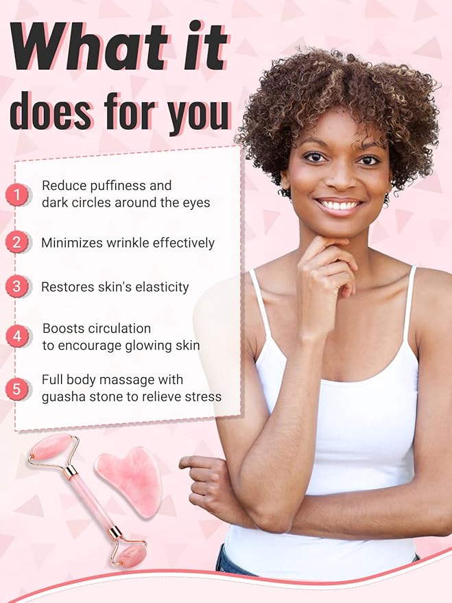 - √ Beauty Skin Care Tools Set - Jade facial roller and Rose quartz Gua Sha stone in the gift box. Roller is ideal for the neck, chin, cheeks, forehead, eyes, nose.You can keep the facial jade roller and Guasha in the fridge.Ice rollers help reduce morning swelling on the skin.
