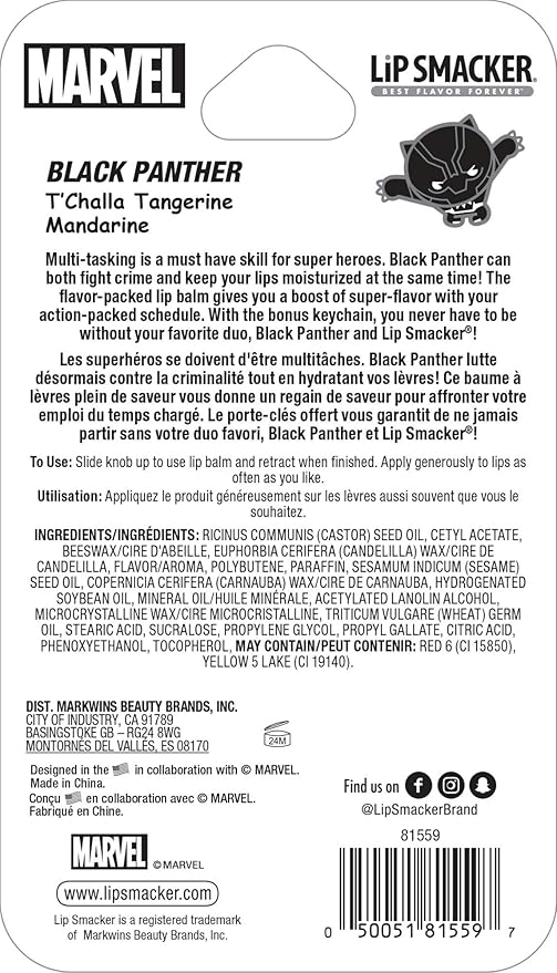 - LIP SMACKER + BLACK PANTHER: Multi-tasking is a must for superheroes. Black Panther can fight crime & keep lips moisturized at the same time! T'Challa Tangerine flavor lip balm in a collectable key chain.