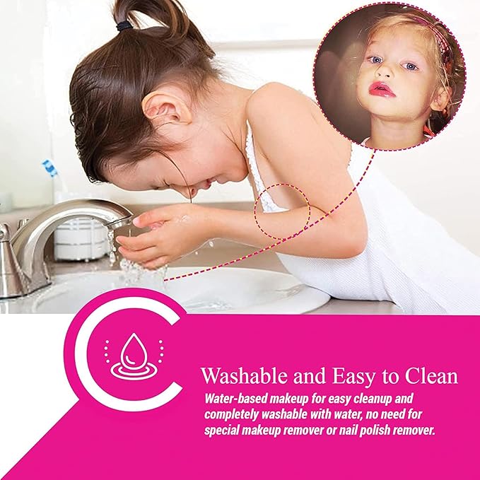 - Washable & Easy to clean: Each color shades goes on lightly for that pretty girlβs made-up look without looking too grown up. Water based makeup for easy to clean and completely washable makeup with water, there is no need for special makeup or nail polish remover. Care for children's skin.