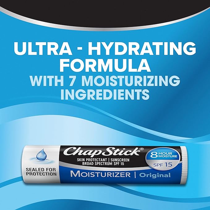 - Hydrating Lip Care: ChapStick Original Moisturizer Lip Balm delivers up to eight hours of hydration and has seven moisturizing ingredients, plus SPF 15