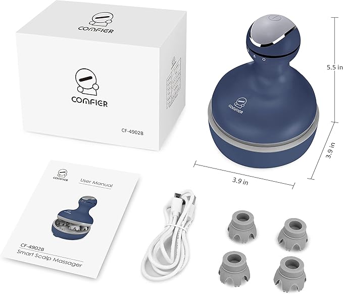 - Comfier Smart Head Massager is equipped with four massage heads with 28 individual nodes each which rotates both in clockwise and anti-clockwise direction giving you a soothing massage to help stimulate hair growth, increase blood circulation to the scalp and relief stress.