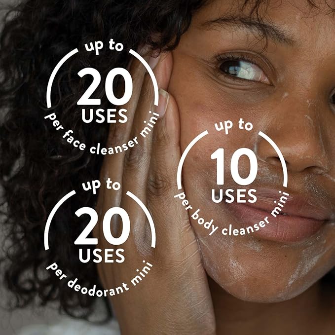 - Contains: Three unscented minis for skincare and body care. A pH balanced face cleanser, a soap-free cream body cleanser, and an aluminum-free deodorant, for fresh, clean skin.