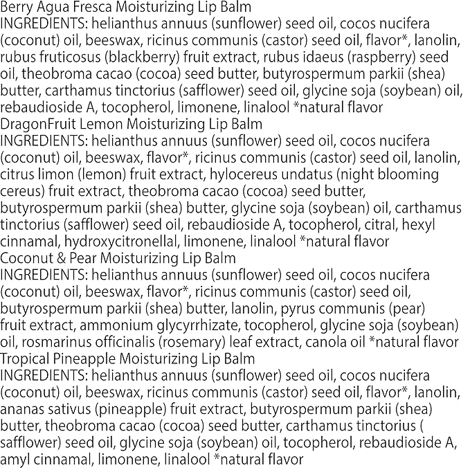 - FOUR REFRESHING FLAVORS: Delight the senses with Berry Agua Fresca, Dragonfruit Lemon, Coconut and Pear, and Tropical Pineapple flavors that will encourage you to apply this flavored lip balm often