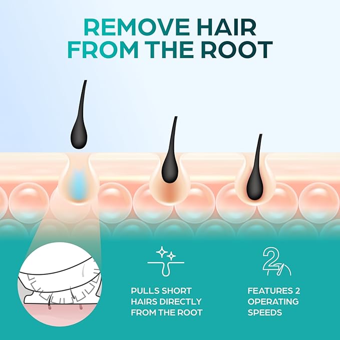 - EFFICIENT HAIR REMOVER DEVICE: The dual speed settings and angle-guide cap help offer a precise, freshly waxed feel. The level 1 speed is for sensitive or gentle skin areas, including the face (not eyebrows) or bikini area. The level 2 speed is ideal for larger areas of the body, like the arms, legs, and underarms.