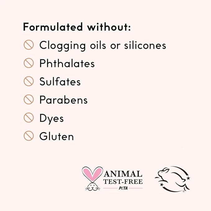 - Formulated Without: Sulfates, silicones, phthalates, parabens, dyes, pore-clogging oils, formaldehyde-releasing preservatives, or gluten. Vegan. Cruelty-Free.
