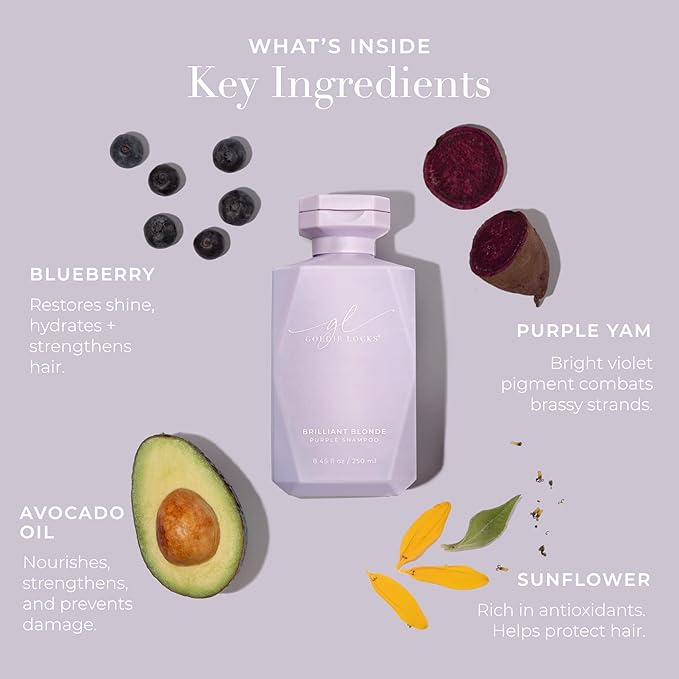 Goldie Locks Brilliant Blonde Purple Shampoo for Blonde, Lightened, Grey Hair, Extensions, Significantly Brightens, Tones, Eliminates Brass, Sulfate-Free, Nourishing, Moisturizing Leave-In, 33.8 Fl Oz