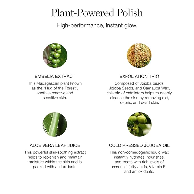- Polished Perfection: This high-performance, plant-based polish effectively cleanses the skin, leaving a visibly soft, smooth complexion, creating the perfect canvas to follow through with skincare and beauty.