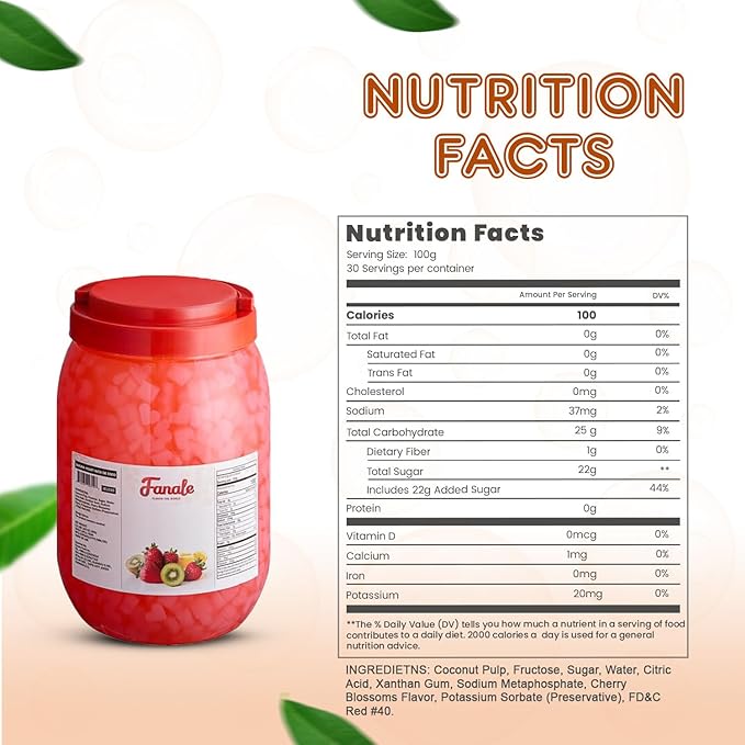 - 𝐒𝐰𝐞𝐞𝐭 𝐚𝐧𝐝 𝐄𝐱𝐨𝐭𝐢𝐜 𝐅𝐥𝐚𝐯𝐨𝐫: Each Fanale coconut jelly boba tea variety is infused with sweet and exotic flavors that complement a range of recipes. This nata de coco jelly topping includes strawberry, lychee, blueberry, mango, sakura, green apple, coconut, Konjac, and coffee flavors, adding a distinct and delightful twist to your creations.