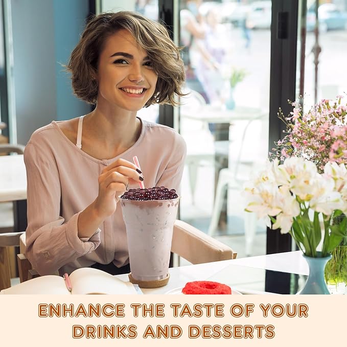 - 𝐄𝐧𝐫𝐢𝐜𝐡𝐞𝐝 𝐖𝐢𝐭𝐡 𝐉𝐮𝐢𝐜𝐲 𝐆𝐨𝐨𝐝𝐧𝐞𝐬𝐬: The fruit boba pearls are filled with natural and organic Blueberry goodness. You get a juicy, mouthful taste of Blueberry with every bite and slurp of your favorite beverages.
