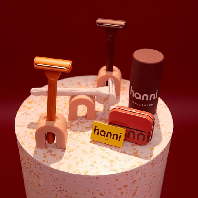 - SHOWER ESSENTIAL: The HANNI Shave Starter Set has everything you need to ditch plastic and upgrade your shave. Includes a weighted razor, Shave Pillow gel, 5 blades, blade bin, and chic Hero Holder.