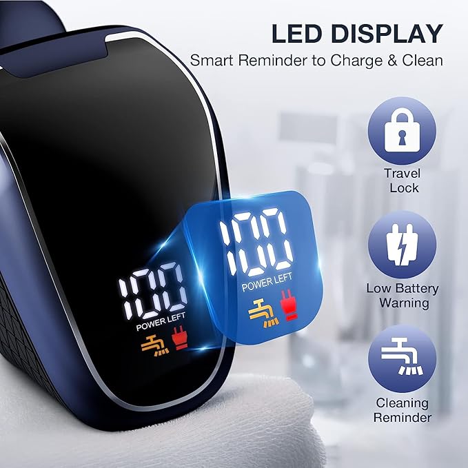 - 【LED Intelligent Display】The men's shaver with LED display can accurately show the percentage of battery power. Low battery reminder, water washing reminder more intelligent. Long press the switch button for 3 seconds to trigger the travel lock to avoid extra power consumption. This electric shaver uses a 600mAh large capacity battery, 1.5 hours of fast charging can provide 90 minutes of working time.