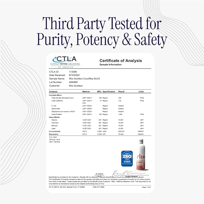 - CONVENIENT LIQUID FORM: Formulated in a liquid form with a fresh mango-orange flavor, Rho Nutrition Liposomal Curcumin + Resveratrol is vegan, sugar free, Keto, non-GMO, gluten, dairy & soy-free. This natural formulation is made with 98% Curcuminoids from Turmeric root extract and Trans-Resveratrol from Japanese Knotweed. Contains no added sugar, fillers, binders, or artificial coloring. Manufactured in the USA in a cGMP facility and third-party tested.