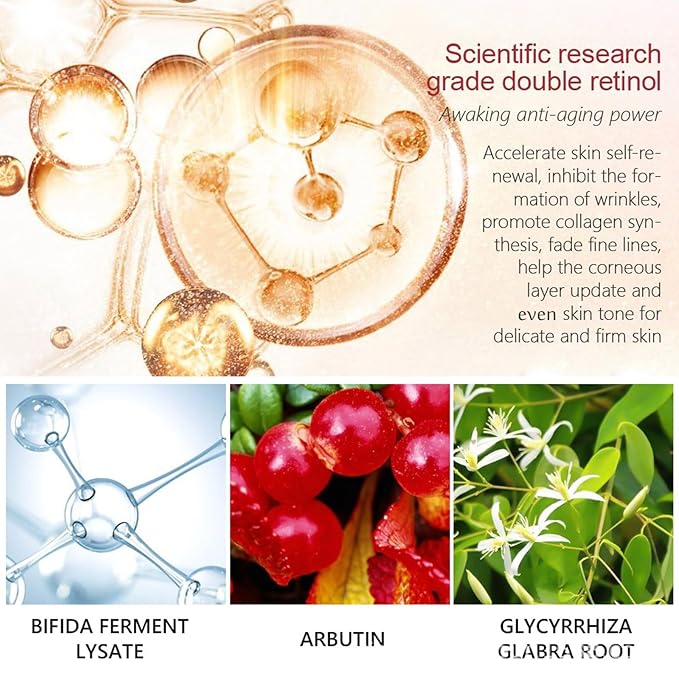 - Powerhouse Ingredients: Double Retinol, Bifida Ferment Lysate, Arbutin, Glycyrrhiza Glabra root. Double Retinol and Bifida Ferment Lysate stimulate collagen production, enhance skin's firmness, and smooth fine lines, wrinkles, and crow's feet. Arbutin reduces dark circles and puffiness. Hyaluronic Acid provides deep hydration. Additionally, Glycyrrhiza Glabra root are included to repair and fortify the skin barrier, while other ingredients and plant extracts moisturize, soothe, even out skin tone, and provide antioxidant benefits.