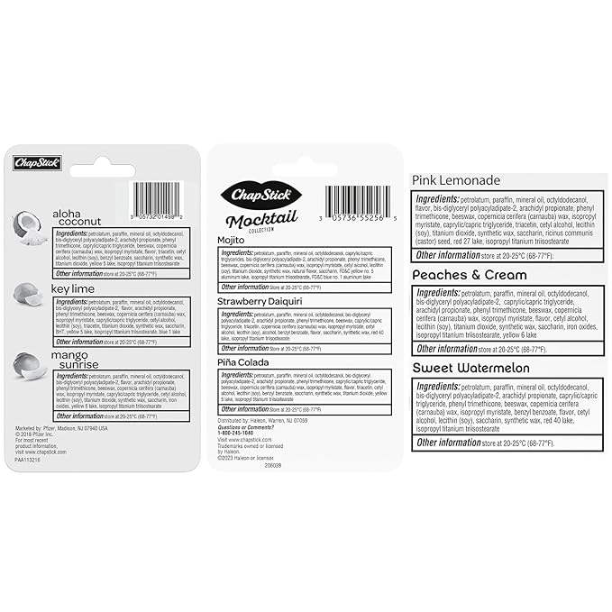 - CHAPSTICK FAN FAVORITES: This flavorful 9-pack includes Sweet Watermelon, Peaches & Cream, Pink Lemonade, Strawberry Daiquiri, Mojito, Pina Colada, Aloha Coconut, Key Lime, and Mango Surprise.