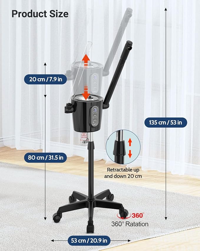 - [Practical & Easy-to-Use Design] The Kingsteam facial steamer features a 360° rotating nozzle, adjustable arm, and height-adjustable mobile stand with a telescopic tube, designed to accommodate your different needs and settings. Whether sitting or lying down, you can easily enjoy spa treatments for your face and neck. The detachable water cup is simple to clean, and we recommend changing the water regularly for optimal performance. The stable, mobile stand with wheels allows for easy movement and secure positioning