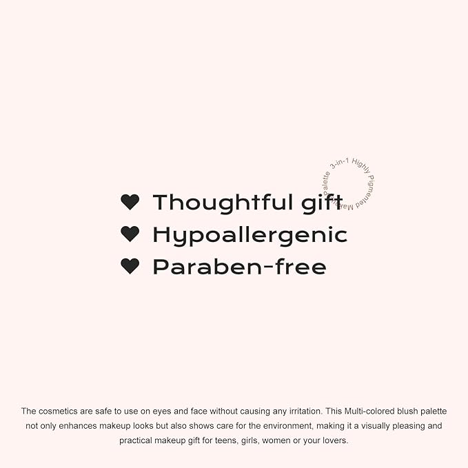 - 3-In-1 Highly Pigmented Stacked Makeup Palette -- This trio is a stacked, comes with a Blush, Contour and Highlighter in a bite-sized palette.Multi-colored makeup palette is a perfect blend of daily complimentary hues Also as contour to accentuate & enhance cheekbones for a fresh, healthy natural-looking flush.