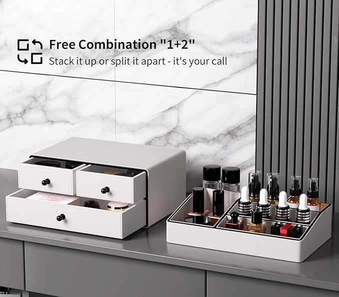 - Stackable 2-Tier Design: The top makeup tray and bottom drawer makeup holder are stackable, allowing you to arrange them according to your space's needs. It fits in various areas such as bedside tables, vanities, offices, and under sinks.