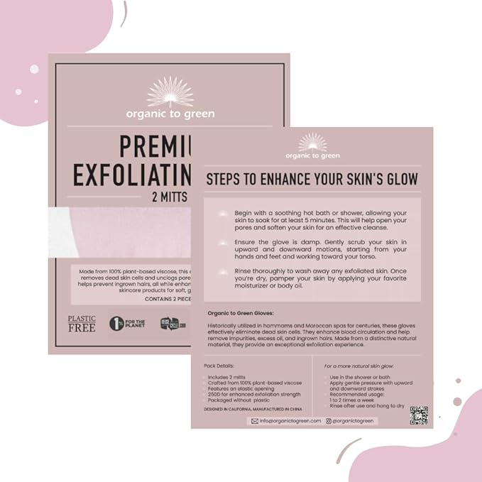- Better than Loofahs or Chemical Exfoliants – Loofahs and chemical exfoliants don’t have the skin-gripping power of our Premium Exfoliating Mitts, meaning they’re not as effective at removing dead skin. Our body mitts are certified vegan, offering a naturally effective alternative – they’re rough enough to deeply exfoliate while soft enough to buff and smooth. Plus, our product packaging includes step-by-step instructions for customized results!