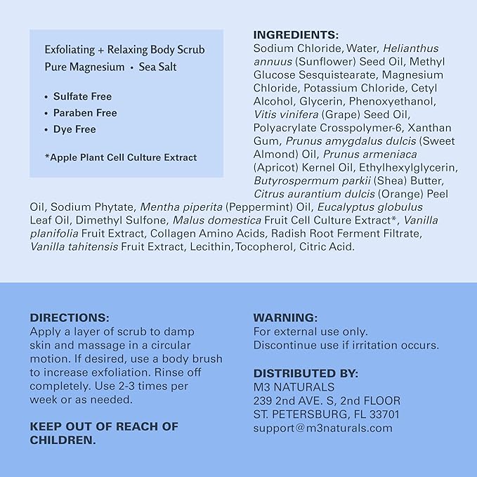 - Skin-Loving Ingredients from Nature: Made with only the finest ingredients for all skin types, M3's Magnesium Bath Scrub has been rigorously examined to keep out unnecessary harsh additives—using only what your skin will love. Made in USA with domestic and globally sourced ingredients. M3 Naturals is a brand that contains products that contain natural ingredients and other ingredients.