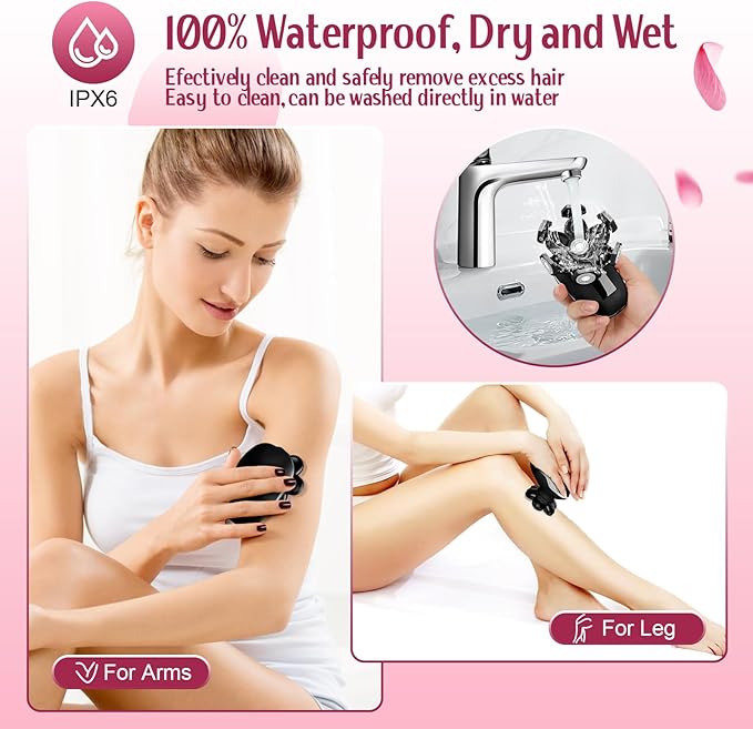 - Wet & Dry Shave: The whole body of the Razor is IPX6 waterproof, can be used in wet or dry conditions! Whether you want to dry shaving or refreshing wet shaving,this hair removal for ladies can satisfy all your needs.After each use, simply rinse the shaver under water for effortless cleaning and hygiene.(No other blade accessories)