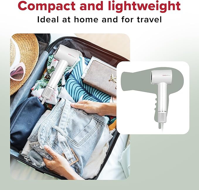 - PROTECTS HAIR FROM DAMAGE: Intelligent temperature control prevents heat damage resulting in healthier hair. The GroWell blow dryer constantly monitors air temperature and adjusts heat level in order to protect hair health.