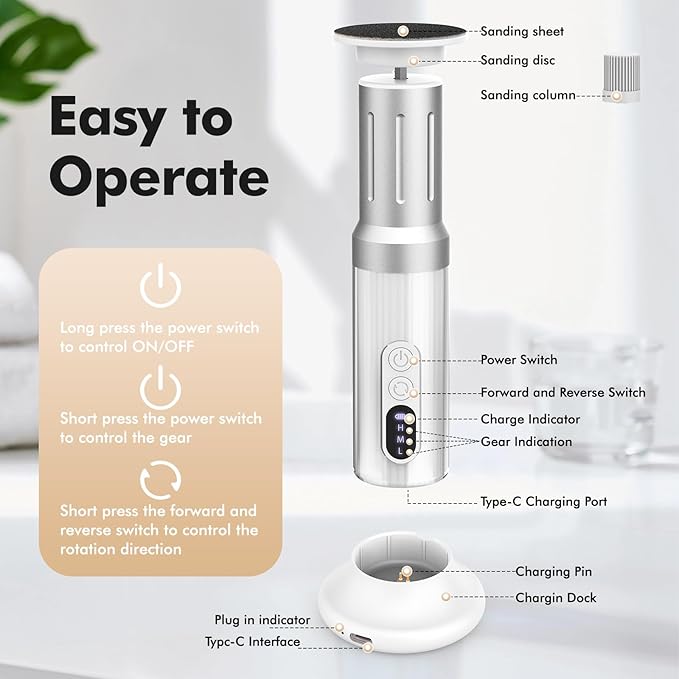 - Easy to operate: There are just two buttons on the electric foot callus remover, long press the power button to control ON/OFF, short press the power button to control the speed, short press the direction button to control the rotation direction. This is a simple and convenient pedicure tools for feet.