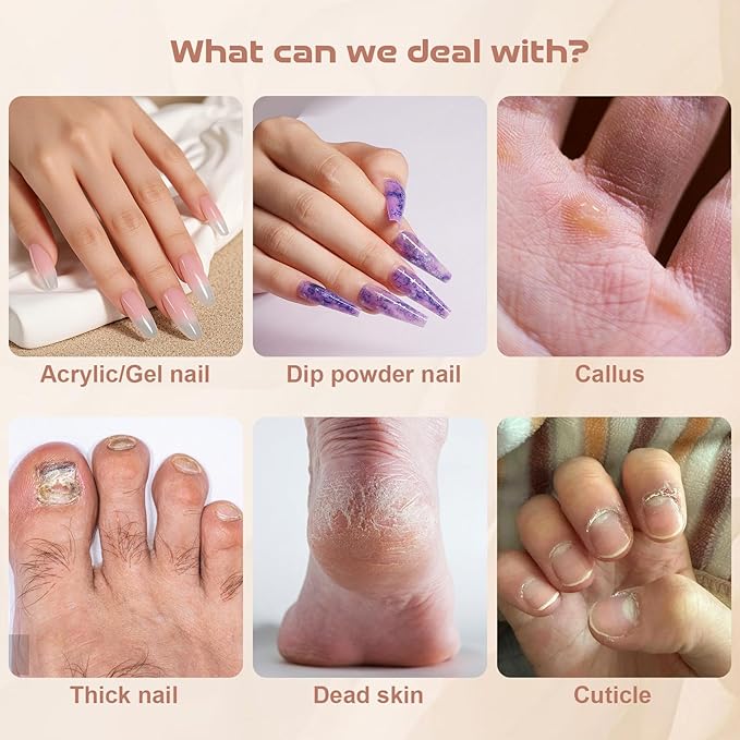 - LOW NOISE & LOW HEAT & LOW VIBRATION: The acrylic nail kit is powerful but with very little noise. The aluminum handle and efficient heat dissipation system ensure a smooth and fast process of nail polishing and gel removal. Its low vibration, low heat and low noise allow you to enjoy professional nail and foot care at home